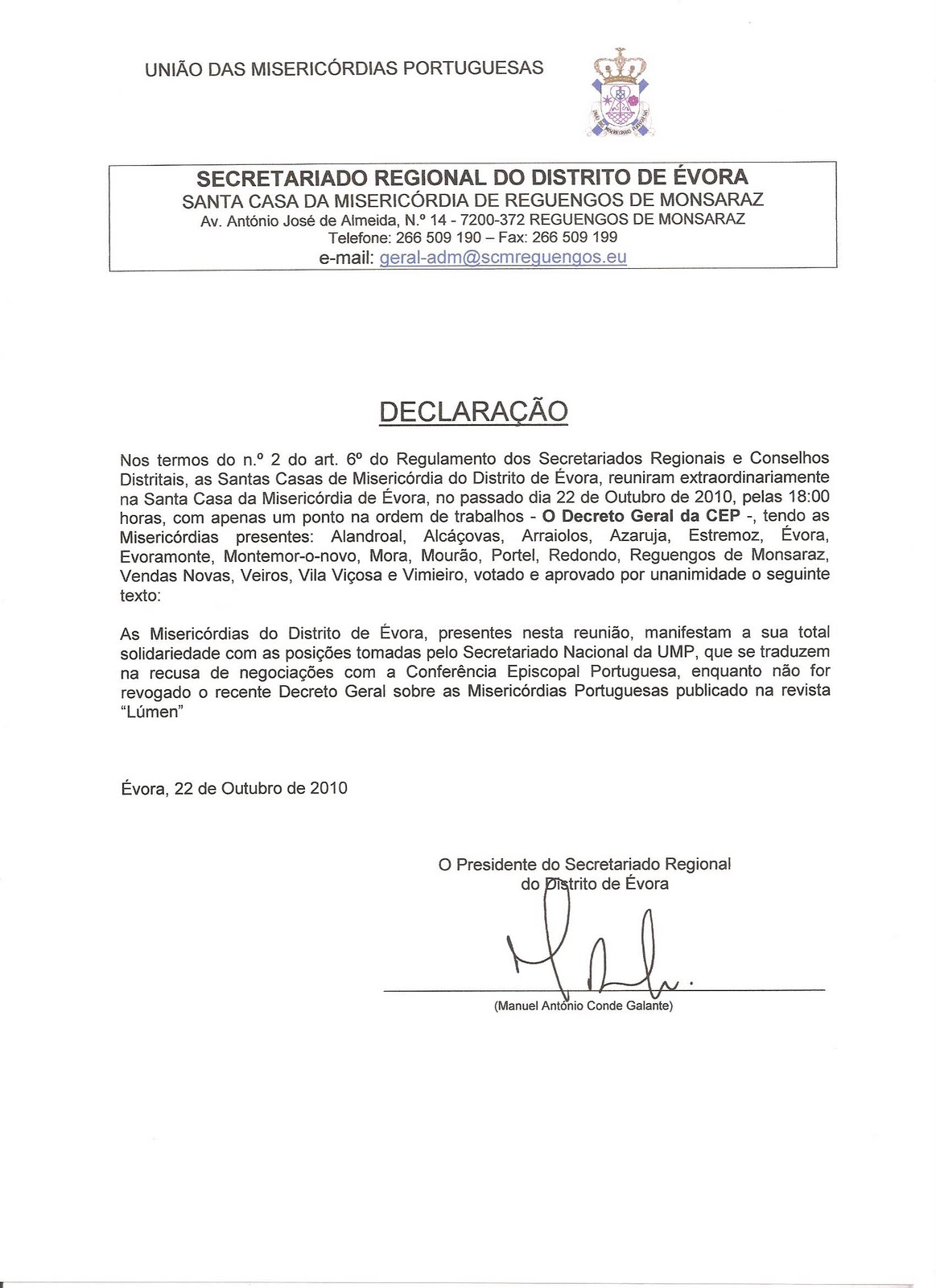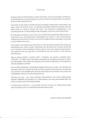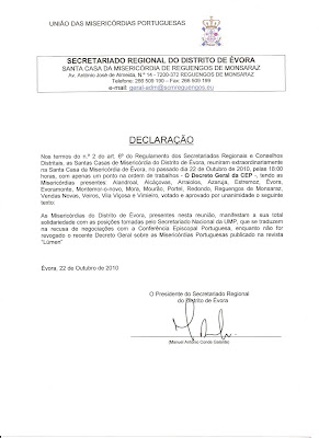 Conclusão: as Misericórdias são parte importante do nosso tecido social e cristão. Todos, Estado, Igreja e cidadãos, temos de lhes estar gratos e apoiar os homens bons e competentes que aceitam desempenhar os ofícios para que são escolhidos pelos irmãos. Tente-se o entendimento, regulamentar as relações entre a hierarquia da Igreja e as Misericórdias, de acordo com o direito e a grandeza destas instituições, que precisam de autonomia para cumprir as suas finalidades, sem caírem num secularismo fechado à comunhão com a Igreja, em cujo seio nasceram. Apoiemos as pessoas de bem com capacidade para dirigir estas instituições, incentivemos o espírito associativo e fraterno, e todos ganharemos com a transparência e o cumprimento do compromisso cristão das Misericórdias.